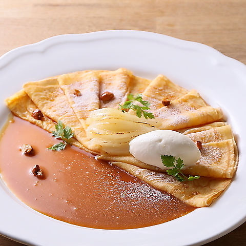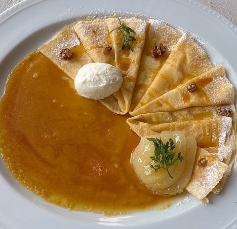 とろ~りキャラメルソースと、旬のフルーツを贅沢に包み込んだ一品。季節ごとに変わる果実の味わいをお楽しみください。夏季はマンゴー・パイン・バナナのどれかになります。冬季は洋梨とバナナになります。