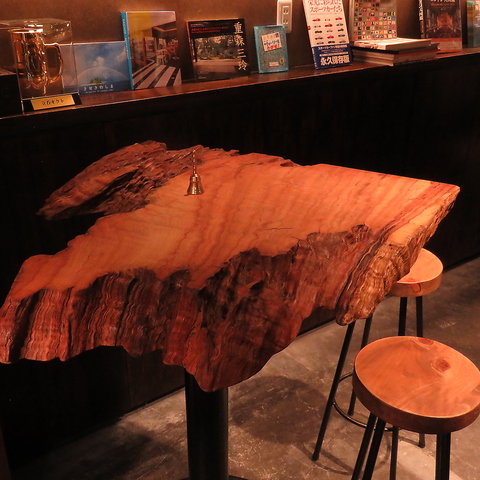 | テーブル | 1名様×50 | 二連の円形スタンディングテーブル。宮崎県綾町産の直径2メートル近くの欅(ケヤキ)の原木は、樹齢推定800年の趣あるテーブルです。ダイナミックかつ繊細な職人技でよみがえった古木を堪能してください♪ |