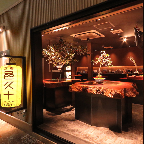 中洲側から川を渡った西中洲の入口にある「デルタウエスト」ビル正面の1階にある”邑久十(オクト)”。広々とした店内は、お一人からでも大人数でも気兼ねなくご利用頂ける仕様となっています。ラグジュアリーな空間で、立ち飲みしながら大人な時間を過ごしませんか?