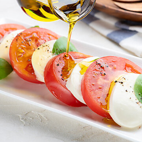完熟トマトの酸味とモッツァレラチーズの濃厚なコク、そこに爽やかなバジルの香りが重なり合う、彩り鮮やかな一皿。シンプルながらも素材本来の美味しさが際立ち、前菜としてもワインのお供としてもぴったりな人気の定番メニューです。