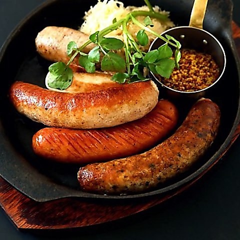ジューシーに焼き上げたソーセージを豪快に盛り合わせた一皿。外はパリッと香ばしく、中からあふれる肉汁は食欲をそそります。種類ごとの風味を食べ比べでき、ビールやワインのお供にも相性抜群。シェアして楽しめる満足感たっぷりの人気メニューです。