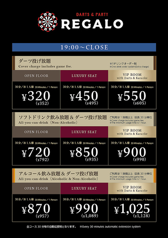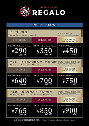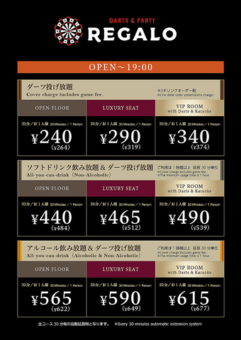 飲みながらにぎやかに楽しくダーツが楽しめる完全個室のVIPルームをご用意しております♪最大12名様までご利用が可能です!合コン、女子会で盛り上がること間違いなしです♪ぜひ大宮のダーツバーREGALO 大宮東口駅前店のご利用をお待ちしております!