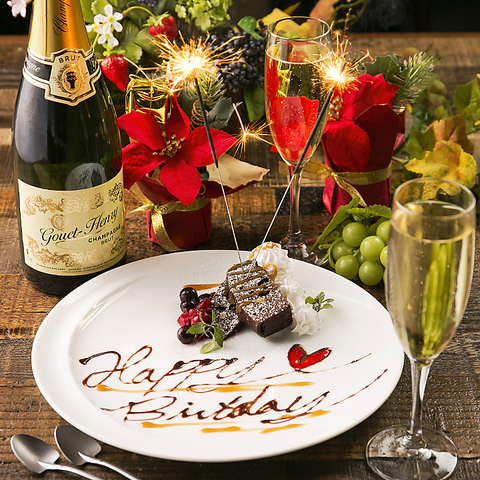 誕生日・記念日のご利用に!コースをご予約でご希望の場合は、コースのデザートをメッセージ付きのプレートに変更OK!大切な方のサプライズ演出に是非ご活用ください。ケーキのお持込やローソクのご用意・人数に応じたケーキのカットなど、ご希望がございましたらスタッフまでご相談ください♪