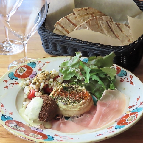 お一人様お一つずつご注文をお願いしております。・赤レンズ豆のスープ・フムスとフラットブレッド(ひよこ豆のディップ)・ファラフェル(ひよこ豆と香草のコロッケ)・ズッキーニのカポナータ・トマトとはだか麦のタップーレ風