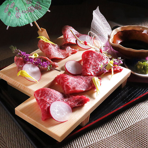 老舗朝日屋直送の松阪牛を使用し、新鮮な赤身を活かした「たたき」や揚げ物にすることでヒレの風味を閉じ込めた「焼きカツレツ」など、創意工夫を凝らした小皿料理をご提供。特製のタレや岩塩とともにお酒のお供としてゆっくりと味わうことで、口の中でとろけるような食感と松阪牛本来の深い味わいが広がります。