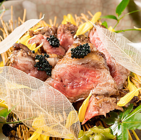 厳選された松阪牛の様々な部位を割烹スタイルで味わう特別なコースです。一品一品に職人の技と旬の食材の繊細な下処理が光り、お造りや揚げ物、焼物と、肉の新たな可能性を感じる構成。ワインや日本酒を片手に、大切な方との語らいを楽しみながらゆったりとコース料理をご堪能下さい。