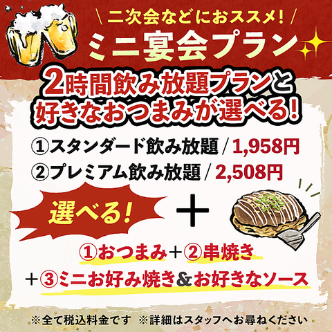 選べるおつまみ、串焼き、ミニお好み焼きがセットになったオトクなプラン!ふらりと気軽に立ち寄れるのも◎