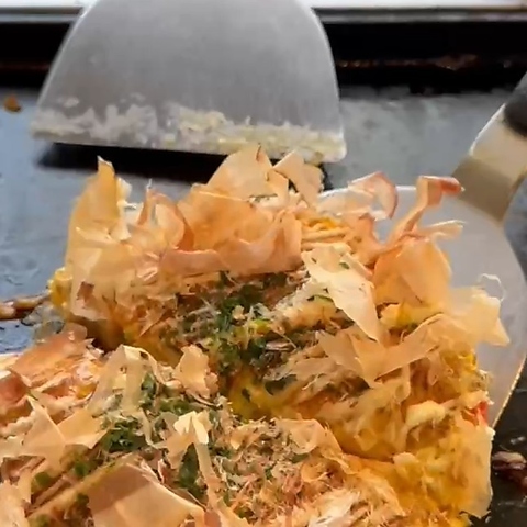 まず鉄板表面に薄く油を塗ります。多すぎはにおいが洋服に移りやすくなるのでご注意!出汁(生地)から具をすくい取り、よく炒めます。炒めた「具」をドーナツ状に、続けて出汁を注ぎ、煮立ったら土手を崩して混ぜ合わせましょう。粘り気が出てきたら食べごろ、薄~く平らに伸ばして完成!ヘラでかき取るように堪能しましょう♪