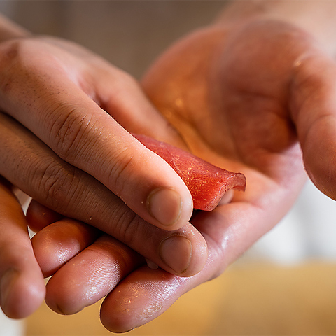 自慢の鮨のネタは、店主自ら毎朝市場へ足を運び仕入れるこだわりの旬魚を使用。定番から季節のものまで、長年の経験で培ってきた目利きで選び抜かれた鮮魚はどれも美味。妥協を許さず、本当に良いと思ったもののみを買い付け、自信を持って皆様へご提供いたします。