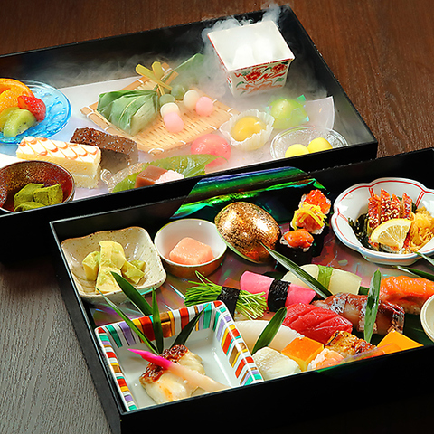 ご宴席をはじめ、接待・会食・お祝いの席にも相応しい当店のおまかせコース。季節の最高の旬食材を使い、熟練の鮨職人が握る本格江戸前鮨でご堪能下さい。お好み等もお気軽にご相談下さい。彩り溢れ光り輝く鮨たちが、宴席を華やかに演出いたします。