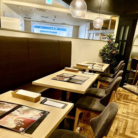 仕事やショッピング帰りに最適なロケーション。柔らかな明かり、シックな色調など、ムード溢れる空間は大切な人とゆったり食事をするのに最適。