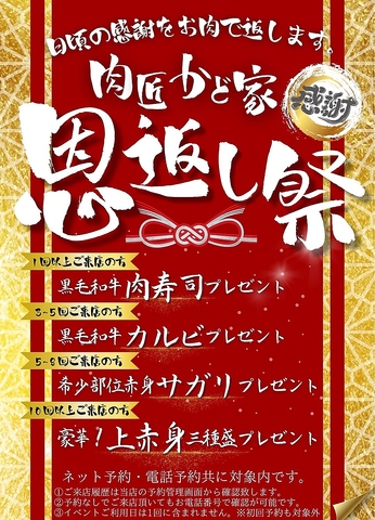 日頃の感謝をお肉で返します!肉匠かど家の恩返し祭!来店回数に応じてお肉をプレゼント!画像チェック!