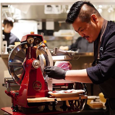 本場イタリアより取り寄せた生ハム専用のスライサーを使用しております。熟練の技術で、生ハムとサラミを限界まで極薄にスライス。これにより、口に入れた瞬間にふわっと溶けるような、シルクのような滑らかな食感を実現しました。凝縮された肉の旨味と芳醇な香りが口いっぱいに広がり、ワインとの相性は抜群です!