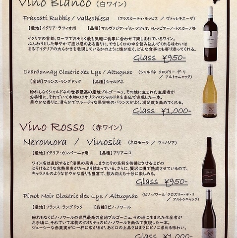 こだわり厳選の月替わりワイン。お手頃価格で、料理との最高の相性(マリアージュ)をご堪能いただけます。
