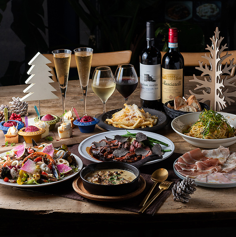 2名様よりお楽しみいただけるシェフ一押しのフルコースです☆たっぷり3種類の前菜から、パスタにデザートまでこだわりの逸品が勢揃い!8名様以上で開放的な個室もご用意しております。女子会、誕生日や記念日にぜひご利用ください。アレルギー対応も承ります。+3,300円で飲み放題付きに変更可能です!