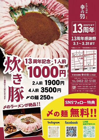 3/1~3/31は13周年記念として、炊き豚を1人前1100円(税込)~ご提供!〆ラーメンも絶品◎この機会にぜひ♪