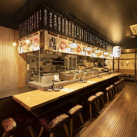 【カウンター】博多の屋台を思わせる活気溢れる店内で一杯いかがですか?!カウンター席は臨場感あふれるオープンキッチンを楽しめます。炭焼きの博多串焼き、鉄鍋で焼き上げる餃子、大鍋のおでんから立ち上る湯気。ライブ感を楽しめる店内!