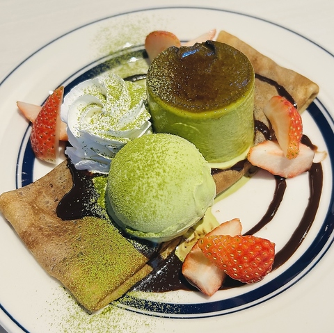こし餡をクレープで包み、抹茶ブリュレ、抹茶アイス、生クリーム、チョコソースにイチゴを添えました♪《セットメニューに+350円でクレープを変更できます》