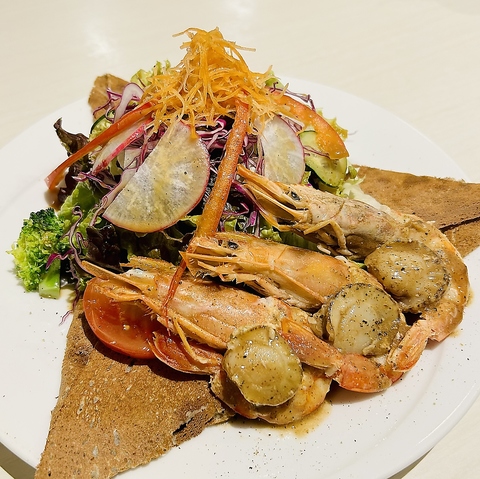 《赤エビとベビーホタテのソテーのガレット》ガレットの中には、キャベツのブリゼ、目玉焼き風タマゴ、チーズ入り。わさびドレッシングのサラダとご一緒にお召し上がりください♪