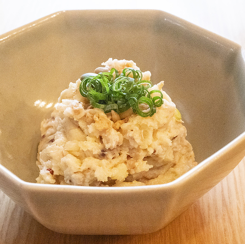 日本酒との相性を追求した『酒呑みのポテトサラダ』には酒盗や白味噌が使われています。しっかりとした食べ応えと、濃い旨みが特徴のポテトサラダに黒胡椒が絶妙なアクセントを加えます♪