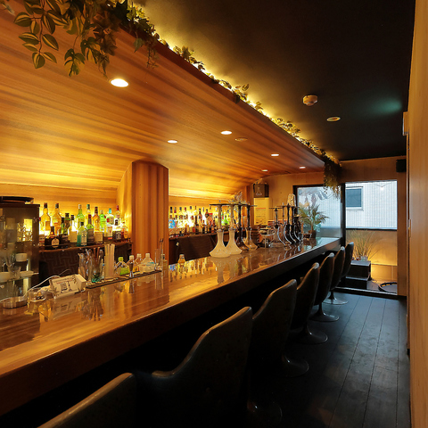 4階のフロアはカウンターのみのバースタイル。間接照明の落ち着いた雰囲気漂う店内でお寛ぎください。
