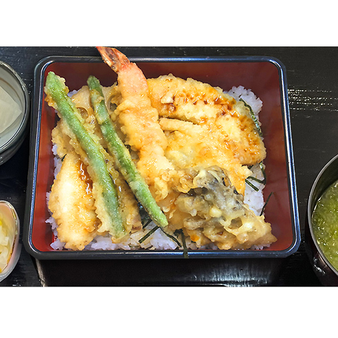 【天丼重の天ぷらを抹茶塩で食べるという選択肢】天ぷら7~8点、かんきつなます、ご飯、漬物、瀬戸内海産海苔の味噌汁/ご飯大盛 +110円(税込)/小盛り -30円(税込)/天ぷら追加(穴子/鮭/牡蠣) 各+260円(税込)※季節により変わります。/塩→天つゆに変更(大根・生姜おろし付) +80円(税込)/+生野菜サラダ +200円(税込)/鮭トッピング可能 +260円(税込)