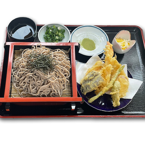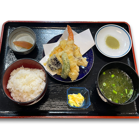 【満足必至の鉄板メニュー】お刺身4種、天ぷら5~6点、三点盛り、ご飯、漬物、瀬戸内海産海苔の味噌汁/ご飯大盛 +110円(税込)/小盛り -30円(税込)/天ぷら追加(穴子/鮭/牡蠣) 各+260円(税込)※季節により変わります。/塩→天つゆに変更(大根・生姜おろし付) +80円(税込)