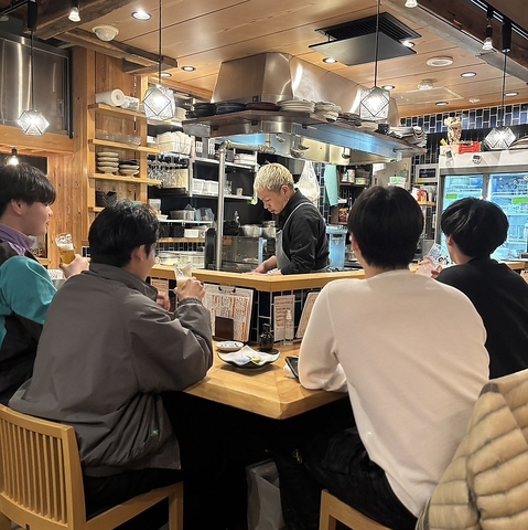 【ライブ感が楽しめる特等席!】目の前がオープンキッチンになっているカウンター席は、職人の華麗な技を間近で見られる特等席です◎魚を捌き、調理していく臨場感はまさにライブ!仕事終わりのサク飲みや、お一人様での利用にも最適です。木の温もりが心地良い和風のデザインで、ゆったりとお寛ぎください♪