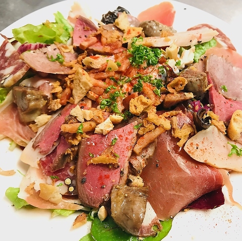 【メイン一例】豚肩ロースのハーブグリエ ドフィノワーズ添え 2750円(税込)/スズキのポワレ 新玉ねぎのクーリー 2750円(税込)/牛ハラミステーキ フライドポテト添え 3410円(税込)/牛バラの赤ワイン煮込み 3630円(税込)/冷製のお肉たっぷりサラダグルマン 2530円(税込)