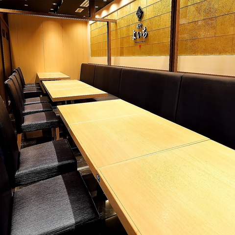 他のお客様を気にすることなくゆったりとお食事が楽しめるプライベートな完全個室。6名様がけが全3部屋、他12名、18名、20名、最大50名収容可能完全個室ございます。大切なお客様と四季折々の魚介を楽しむ贅沢な時間をどうぞ。