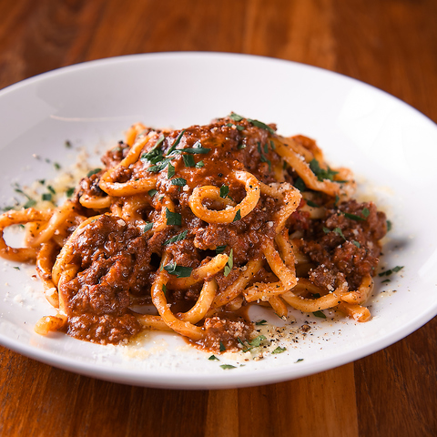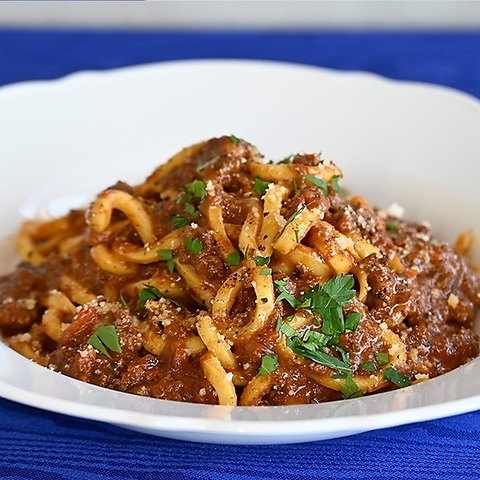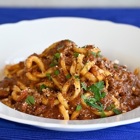 シェフが修行時代の師匠から受け継いだ伝承レシピ。シナモンの香りと肉肉しさ溢れる粗挽きボロネーゼは他では味わえない究極の逸品。浅草開化楼の極太トンナレッリ・ロマーナとの組み合わせはもはや最強タッグです!