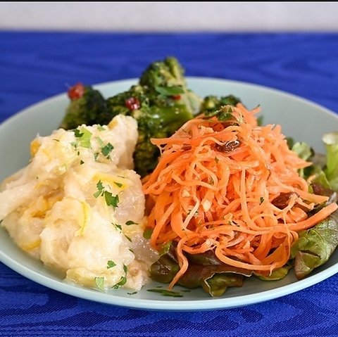 お野菜を中心とした本日の前菜3種盛り合わせ。四季折々の旬野菜をふんだんに使った、色とりどりの美味しさが詰まった一皿です。各素材の特性を活かす調理法と絶妙な味付けで仕上げられ、目でも楽しむことができます。新鮮な野菜の甘みや香りが引き立っています。お食事の始まりにぴったり。乾杯のドリンクと共にどうぞ。