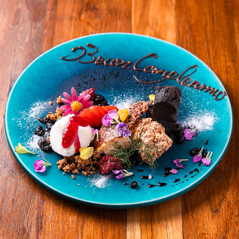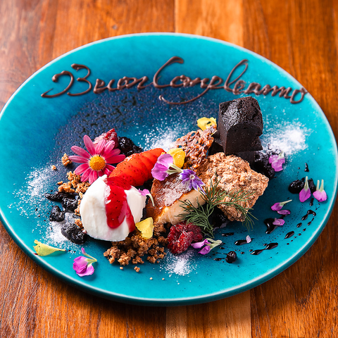 特別な記念日を華やかに彩るメッセージ入りのデザート盛り合わせをご用意。シェフお任せのドルチェは、その時々の旬の素材を活かした絶品の数々。事前の予約が必要ですが、コースご利用のお客様はお得なクーポンもご利用可能。大切な人との思い出に残るひとときを、特製デザートでぜひお楽しみください!詳細はスタッフまで