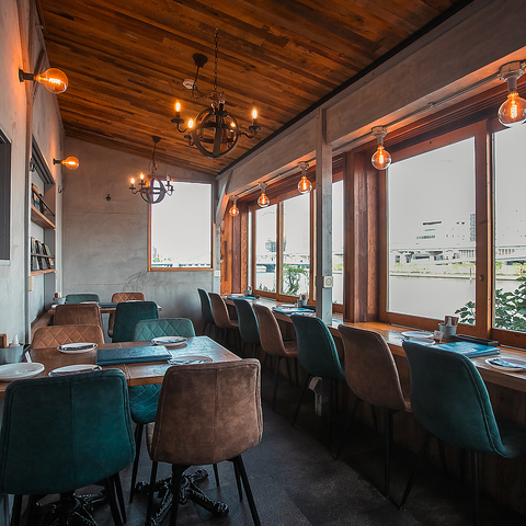 大きな窓から見える隅田川やスカイツリーを一望できる眺望抜群のリバーサイド席。窓際のカップルシートは人気です。大切な友人や家族、デートにぴったりのゆったりとした空間。少人数での飲み会にもおすすめです。木目調のテーブルやシックな壁、雰囲気のある照明が織りなす空間で、心地よいひとときをお過ごしください。