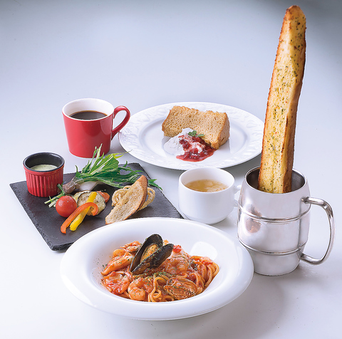 《人気No.1》お好きなパスタにお好きなセットをチョイス!生パスタにシャキシャキサラダやロングバケットなどが付いた、大満足のランチコースとなっております!もちもち生パスタは、メニューより全種類からお選びいただけます!パスタもバケットも、どちらも楽しみたい方におすすめ◎