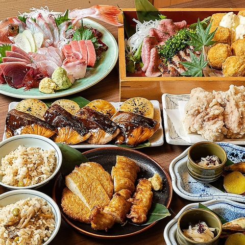 日本酒常時50種類以上!幹事さまも安心!飲み放題付コース多数からお選びいただけます。