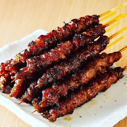 当店の看板メニュー!脂の少ない鶏の首皮を一本一本、丁寧に手巻きし、じっくりと何度も下焼きを重ね、50年注ぎ足しの秘伝のタレを染み込ませ旨味を凝縮させた、まさに『一皮入魂』のとりかわです。秘伝の「タレかわ」又はカリカリの「塩かわ」の2種類からお選びいただけます。やみつきの美味しさをご堪能あれ♪