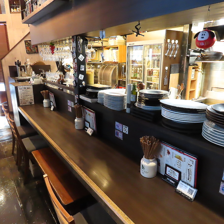 スタッフの方との会話も楽しみながらお食事のできるカウンター席!