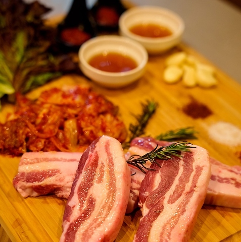 食べ応え満点のサムギョプサルがメインのコースはビビンバやチゲなど定番の各国料理がついて全6品120分飲み放題付き3500円♪おしゃれなデザイナーズ空間で味わう本格韓国料理のお店です。焼肉/韓国料理/女子会/デート/誕生日/宴会/個室/貸切/ソファー/食べ放題