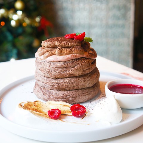 ほんのりビターなココアをたっぷり練り込んだふわふわ食感のパンケーキ生地に、軽やかなメレンゲ、マスカルポーネのチョコムース、ベリージャム、ベリームースを贅沢にトッピング。