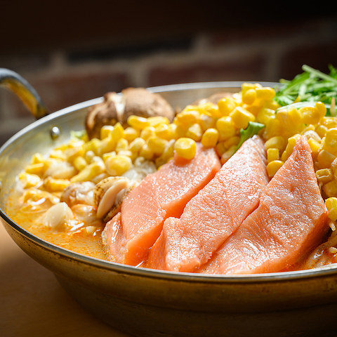 脂の乗った鮭を主役に、海鮮の旨味を重ねた特製味噌仕立ての石狩鍋。濃厚でありながら後味はまろやか、ひと口ごとに身体の芯から温まります。コーンや野菜の甘みも溶け込み、最後の一滴まで楽しめる自慢の一鍋。接待やご宴会、大切なお集まりにもふさわしい逸品です。ぜひご予約のうえ、出来立てをご堪能ください。