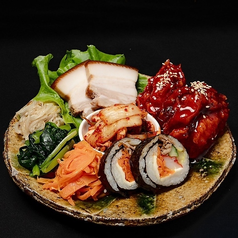 あなたの食欲を満たす【魅力的な前菜盛り合わせ】がここに!蒸し豚とヤンニョムチキンは、最高のコンビネーション。色とりどりのナムルや風味豊かなキムチ、そして手軽に楽しめるキンパが、まさに一皿の中にを詰め込んでいます☆一度食べれば、その美味しさに心奪われること間違いなし!