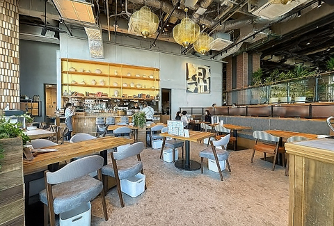 天井高6mの大きな窓から自然光が差し込む明るい店内。木の温もりと緑が調和した心地よい空間で、ランチやカフェ利用にも最適。お子様連れや女子会など、幅広いシーンでくつろげます。