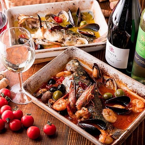 創業以来の名物!鮮魚丸ごと一匹使った本格アクアパッツァ!豊洲から直送される鮮魚を一匹丸ごと使い、旨みを凝縮したアクアパッツァ。日ごとに魚種が変わるため、その時だけの美味しさが味わえる特別な一皿です。創業当時から愛され続ける看板メニューをぜひお楽しみください。