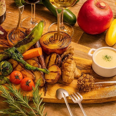 採れたて旬野菜×自家製ソース!農園風バーニャカウダ!農家直送や市場から仕入れた新鮮野菜・季節野菜をたっぷり使用。野菜本来の甘みを引き立てる、自家製バーニャカウダソースが自慢。温かいソースに絡めて、素材の旨みを贅沢に味わえるヘルシーな一皿。ワインとの相性も抜群!