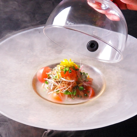 瞬間燻製のパフォーマンスや調理する直前の活きたオマール海老をテーブルでお見せするなど驚きのサービス。