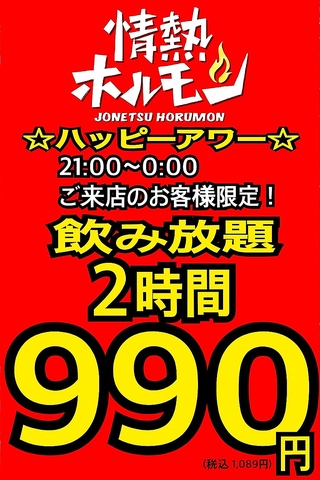 情熱ホルモンはのハッピーアワー!21時~0時までの来店で飲み放題がなんと!1089円!!生ビールも含む飲み放題です!ぜひご利用ください♪