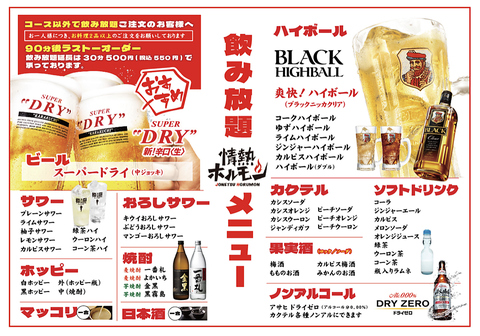 【情熱ホルモン】が人気の秘訣の一つ!お酒がとにかく安い!生ビールはアサヒスーパードライで1杯290円、ハイボールはブラックニッカで1杯190円でご提供★他にも種類豊富なドリンクメニューを取り揃え!衝撃価格のお酒は時間たっぷり楽しめます!美味しいお肉と一緒に是非ご堪能ください!