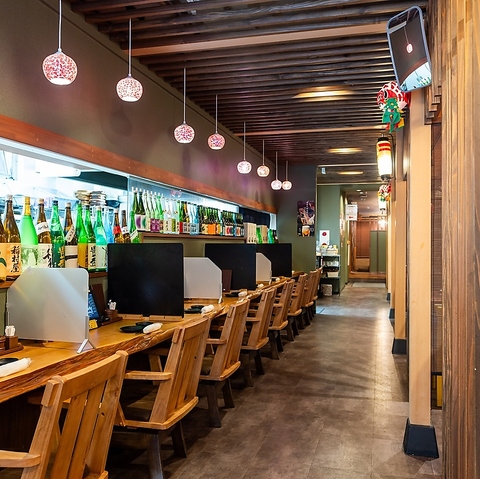 店内はこだわりの照明や木を使った落ち着いた雰囲気。カウンターはお一人様かたご好評。