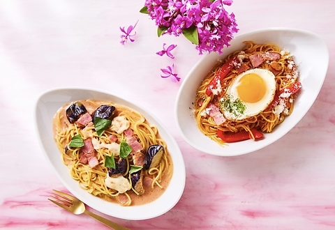 ソーセージエッグナポリタン右/ナスとモッツァレラのトマトクリーム左